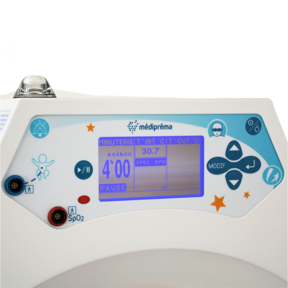 Intuitive and easy to use, it features a control box with an eye-level LCD display that makes it easy to program exposure time with an hour meter. A pause button is also available to suspend the treatment in the event of an operation on the child.